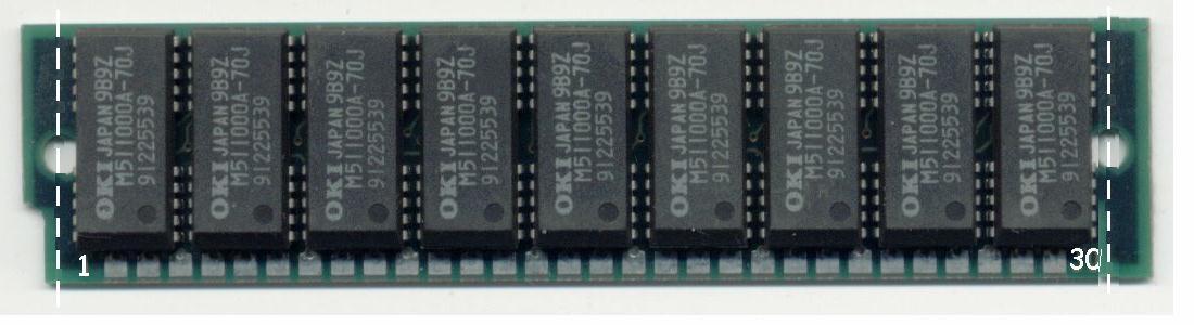 Do tego potrzebne będą 4szt. SIMM 1MB starego typu 30pin i, oczywiście, karta 1M. SIMMy powinny mieć 8 lub 9 kostek pamięci. Każdy SIMM trzeba obciąć z obydwu stron w miejscach oznaczonych linią przerywaną tak, by zmieściły się obok siebie na karcie w miejscu wylutowanych elementów.