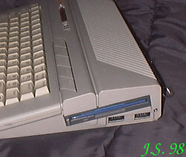 Poniżej prawej krawędzi napędu widoczny jest wkręt, który zastąpił brakujący. Z tyłu widoczne są zatrzaski od złącza Centronics, które to złącze zastosowałem do podłączenia zewnętrznego napędu 720K 5,25". Interfejs Karin Maxi umocowałem wewnątrz nad gniazdem kartridża. Simm 1M leżał na podstawowym banku pamięci,pozostała logika umocowana była na istniejących układach i połączona kynarem. Oryginalny zasilacz już nie wystarczał do zasilania całości, więc zastosowałem impulsowy 5V/5A.
