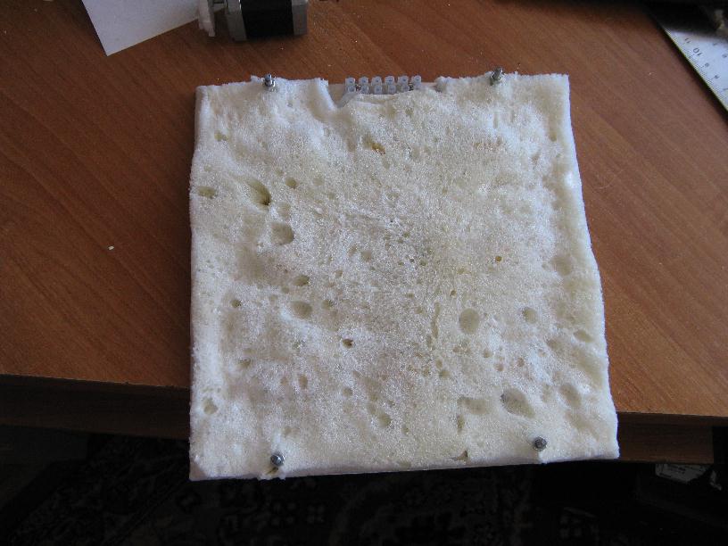 Kupiłem też materiał na hotbed - 4mm blachę duralową o wymiarach 225 X 225 mm. Zacząłem robotę od pocięcia kątownika aluminiowego na krótkie odcinki o długości rezystorów ceramicznych, których miałem spory zapas. Blachę, po wywierceniu otworów na mocowanie złączki na przewody i wkręty poziomujące oczyściłem i odtłuściłem. Za pomocą kleju termoprzewodzącego przykleiłem rezystory i kątowniki. Te ostatnie służą do lepszego odprowadzenia ciepła od rezystorów. Po zlutowaniu rezystorów i przyklejeniu termistora okleiłem spód taśmą kaptonową. Przykręciłem teżzłączkędo zasilania. Po miesiącu drukowania złączkętrafił szlag, więc przewody zasilania stołu przylutowałem bezpośrednio i przykleiłem je silikonem termoprzewodzącym. Spód stołu w celu minimalizacji strat ciepła pokryłem pianką poliuretanową i zestrugałem ją do odpowiedniej grubości: