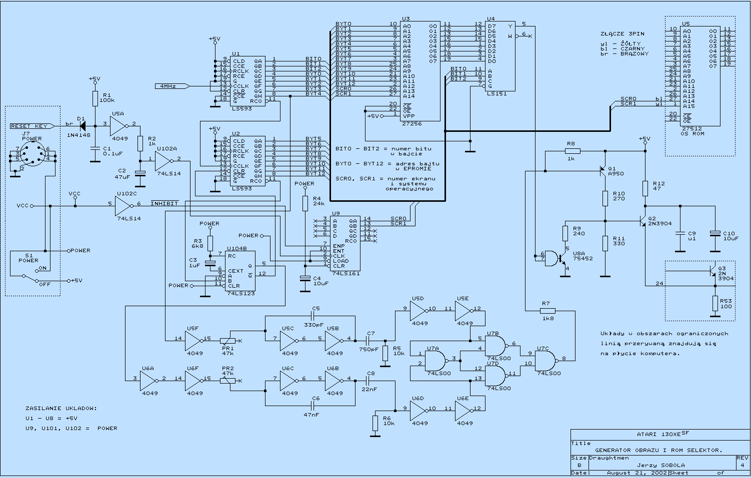 Pochwaliłem się tym na jakimś forum i pewien gość z Francji koniecznie chciał to mieć. Sprzedałem mu to w końcu, bo chciałem zrobić nowszą wersję. Zanim się do tego zabrałem już kolega z Francji "zapotrzebował" jeszcze jeden taki zestaw. Zostałem więc zmuszony niejako do dalszych prac. Poszedłem nieco dalej i, z braku kolejnego wyświetlacza, wymyśliłem generator obrazu, który wyświetlał aktualny system na ekranie monitora, oczywiście gdy komputer był wyłączony. Wtedy też można było dokonać wyboru systemu za pomocą naciskania klawisza RESET. Miałem sporo kłopotu z uzyskaniem stabilnego obrazu, aż w końcu zwyczajnie zerżnąłem fragment układu z TRS80. Obraz, a właściwie 4 bitmapy obrazów o różniącej się treści i rozdzielczości 256X256 zawartych było w epromie 27C256, czyli na każdy obraz przypadało 8K. Tak więc okroiłem ilość systemów do czterech, choć układ mógł być w prosty sposób rozbudowany do ośmiu systemów poprzez zastosowanie epromu 27C512 dla bitmap i 27C010 dla systemów. Kolejny bit licznika U9 (QC) powinien być podłączony wtedy do A15 epromu bitmap i A16 epromu systemów. Obrazy tworzyłem na pececie jakimś programem graficznym. Były to czarno-białe obrazy z tekstem wypisanym czcionką taką jak logo Atari. Poniżej przedstawiam schemat układu: