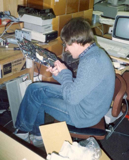 Pewex sprzedawał coraz więcej komputerów, pojawiła się seria ST, a także 130XE i 65XE, drukarki 1029, w końcu XE System, modem XMM301 i 80-kolumnowy interfejs XEP-80. Było dużo pracy, pojawili się nowi koledzy: Wojtek Grudziński i Piotrek Żemek (*EMEK), który na zdjęciu "walczy" z płytą 1040 ST.